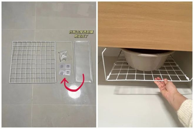 方法很简单:网购一片「网格片+PVC货架挡板+粘贴挂钩」,然后将其拼装起来,粘贴在浴室柜底部即可。