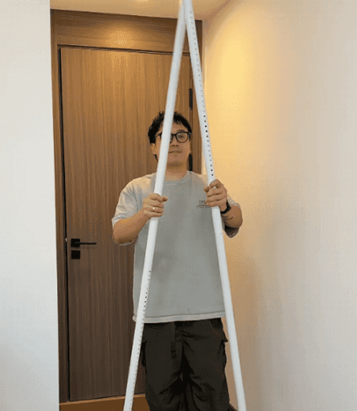 方法很简单:先将伸缩杆以顶天立地的方式固定住,再用扎带将网格片固定上去,然后根据门后的空间尺寸裁剪一下网格片,并找一块木块辅助把它弯成L形装上去即可。