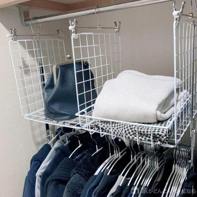 2)用网格片拼装一个网篮,再用衣架挂钩把它挂在挂衣杆上,就让原本的「长衣区空间」,得到了进一步收纳扩充。