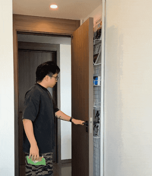 4)不只是衣柜内部空间,衣柜门背面也可以用「网格片+粘贴挂钩」,做进一步收纳,一寸空间也不会浪费。