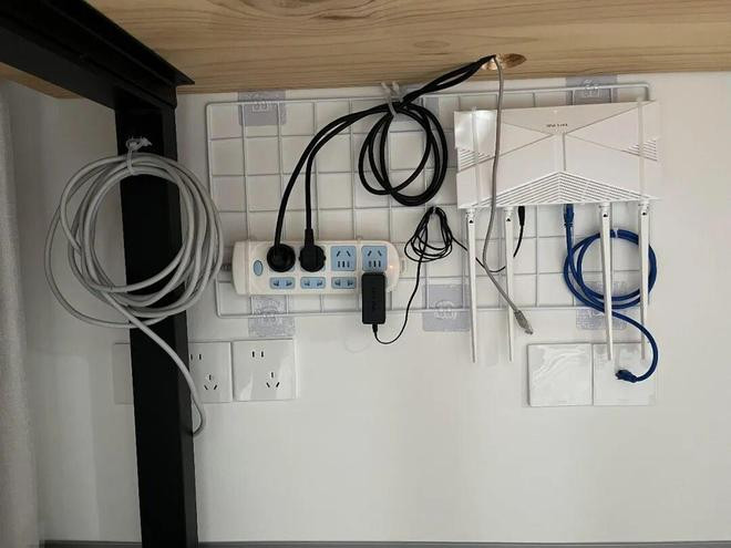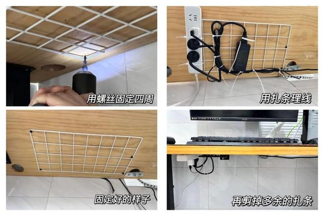 只需要用粘钩把网格片固定在墙面上,再用扎带将各种线路、插排、设备理好固定,空间立马就清爽多了。
