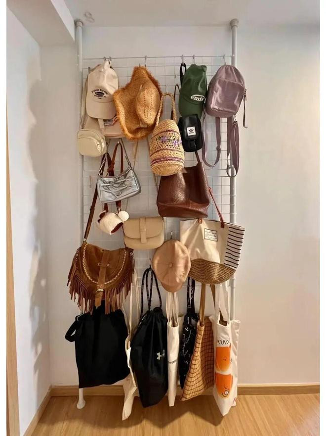 另外,包包和帽子多的家庭,还可以用挂钩做收纳辅助,日常拿取一目了然,并减少了凌乱。