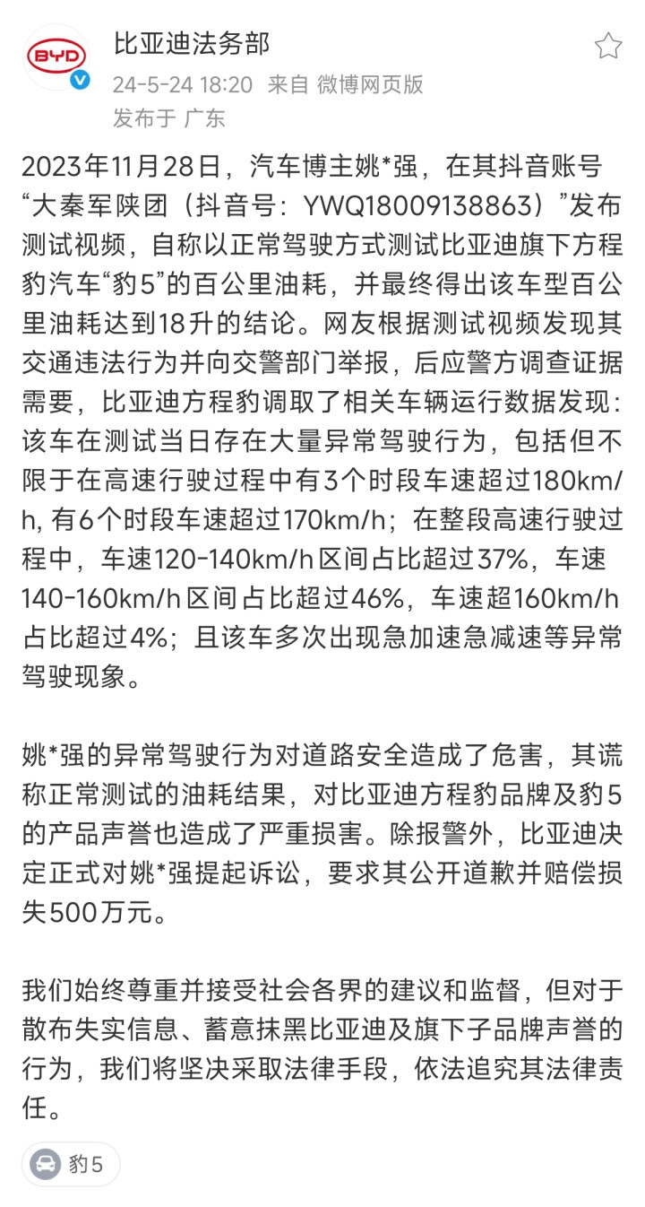 可就在此时,有不少汽车博主以测试为由做了不少“昧良心”的事,其中就包括了“姚十八事件”。当时的豹5因为采用了新一代超级混动技术,百公里馈电油耗8.35L左右,在越野车市场是优秀的代表。也正因如此,有人以此为理由,做了测试,大部分都相差不大,也有博主测到了7L多。但是,汽车博主姚某强却在测到了18L!而且是以正常驾驶测试出来的结果!由此迅速引起了舆论发酵!
