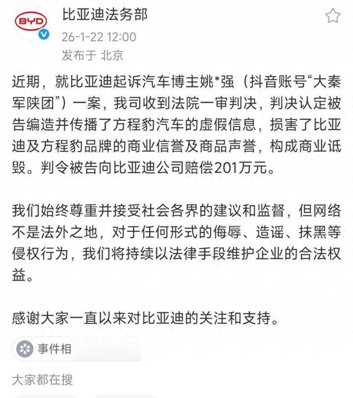 “姚十八事件”过去已经两年多了,最近终于盖棺定论了:构成商业诋毁,判罚201万元!该事件发生于2023年11月,当时的比亚迪旗下子品牌刚成立不久,发布了首款硬派越野方程豹豹5,这种越野车搭载了比亚迪自主研发的DMO超级混动越野平台、CTC2.0底盘电池一体化技术、云辇-P、智能越野辅助技术等诸多行业首创的新能源越野车技术,该车一经发布在当时可谓是最热门的车型!